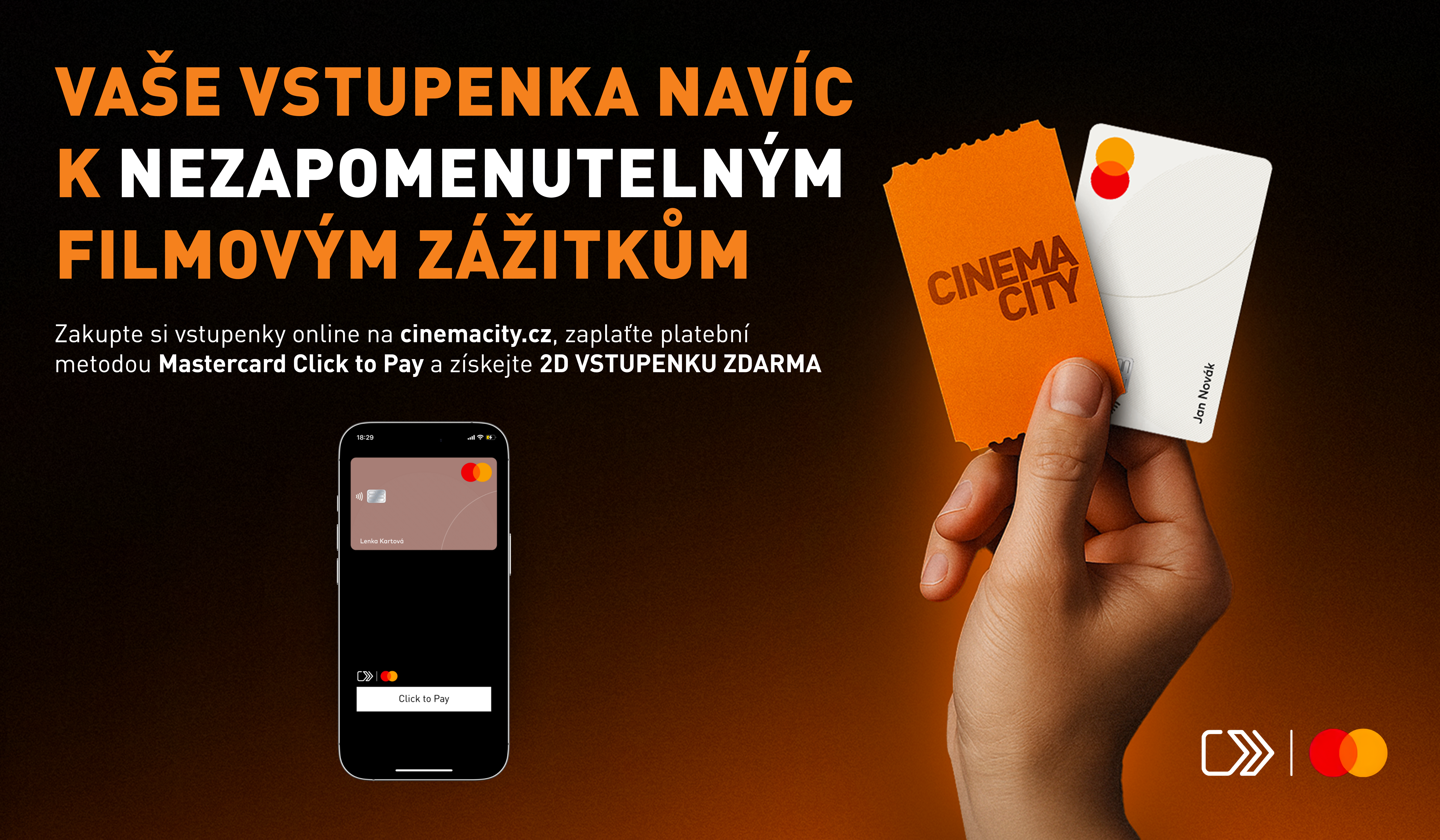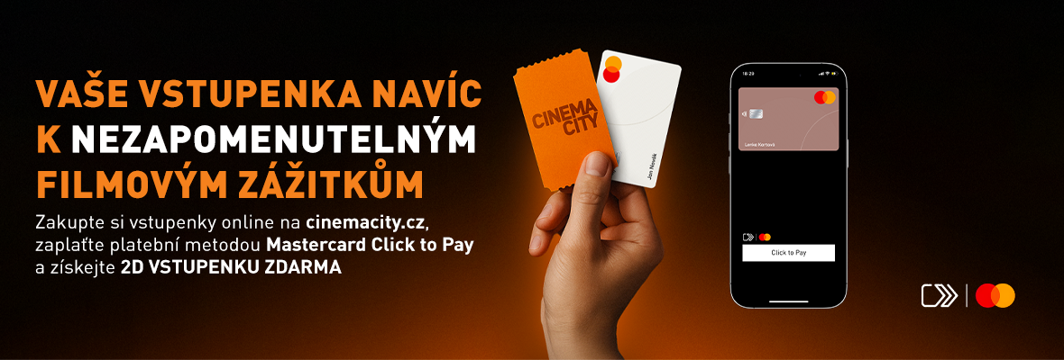 Při nákupu vstupenek na webu Cinema City zaplaťte metodou Click to Pay od Mastercard® a my vám pošleme 2D vstupenku zdarma. Akce platí jen po omezenou dobu - tak ji nepropásněte!