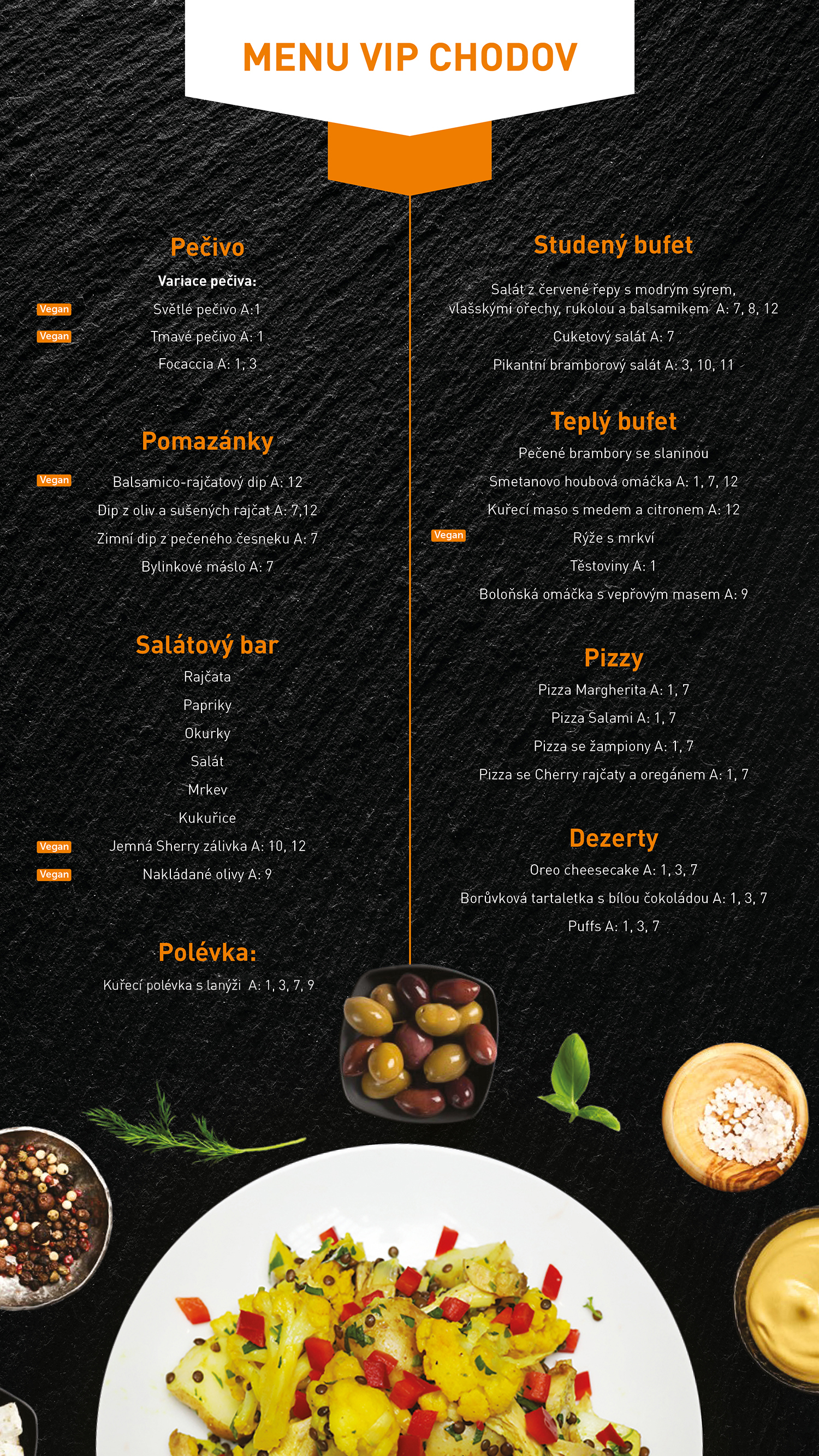 Bufet s teplými a studenými pokrmy složený z originálního menu, nabízí například dva druhy pizzy, fussilli a salátový bar. Vybrat si můžete také ze tří typů sladkých dezertů. Toto vše je vám k dispozici 30 minut před a 30 minut po začátku projekce.