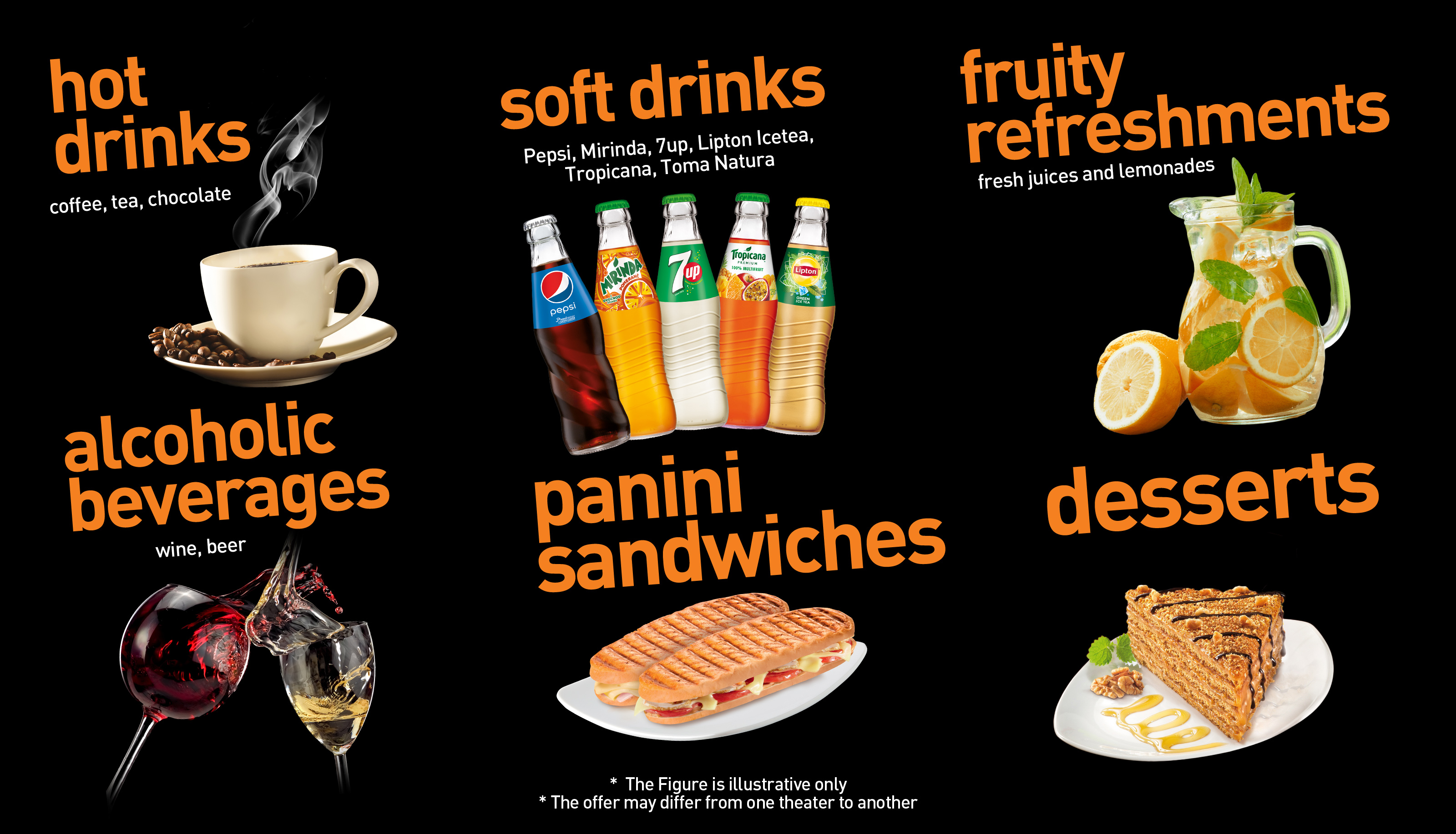 It is scientifically proven that a cup of coffee makes miracles. Because Cinema City has created the perfect setting for enjoying precious moments with friends or family before or after the movie. All delicious coffee drinks, Macchiato, Moccacino, Latte or any other combination you want in an elegant and comfortable setting. Hot drinks, various kinds of coffee, alcoholic and non-alcoholic drinks or desserts are available.